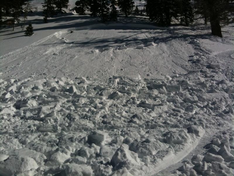 Canyons reported 8'' this morning and we were just up the ridge from Killington Chutes. We decided to find the open bowl off the ridge that's visible from Condor, Desperado I believe. We knew it was a steep sustained pitch and thought the new snow instabilities would be manageable. I ski cut the top of the bowl which produced nothing and I watched from a safe zone as my wife skied the line. She stopped 1/2 way down to let the sluff she produced pass. Due to multiple small roll overs and the sustained pitch of the line we should have communicated before dropping that one would ski the whole line and wait in the safe zone at the bottom. I instead waited 90 seconds or so and ended up skiing up on her and noticed some significant sluff as well. We were both stopped just above this opening at the bottom. Em finished the line skiers right. I waited for her visual/audible and dropped into the main bowl, again ski cutting across the top of the opening. My sluff cut out the soft slab about 20 ft above me but I skied out without incident. I stopped in the safe zone in time to turn around and see the moving snow, seemed like slow motion. For how steep the line was it was moving slow. This line has slid a few times this season I believe.