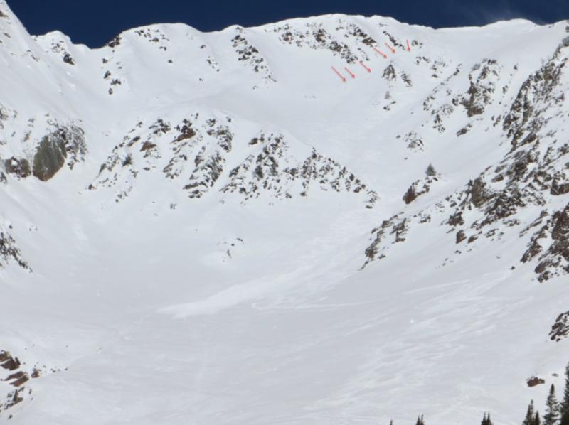 Strong N winds on the ridgeline up to Superior. We dropped into the main shot of the south face of Superior at 0845. A slope cut released a small (30 ft across, 4 inches deep) wind slab below the skier. The slide ran for probably 1000 ft down the gully. About 200 vertical feet below the summit, another slope cut/traverse triggered another wind/soft slab (80ft wide, 4 inches deep, red arrows on photo) that propagated outward on both sides of a ridge and ran for 900 vertical. The wind slabs were very reactive. The surface underneath was hard sun crust. The slides were very manageable and broke away below the skier both times. The snow lower down on the shot was variable and ranged from dense powder to sun/wind-affected crust.