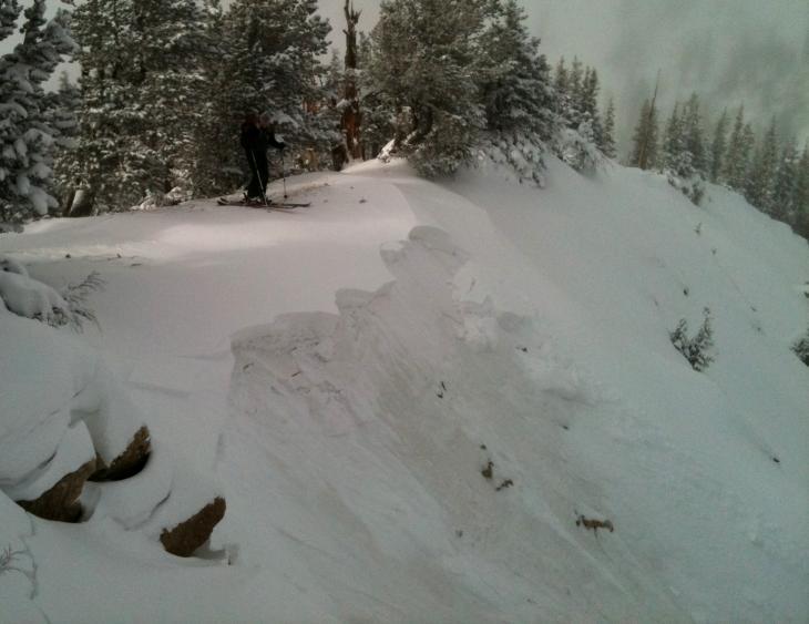 Wind drifted areas cracked easily, and could fail either on the weak surface facets right beneath the newer snow, or all the way down on the mid pack facets. Also got distinct woomph and a small foot deep release (that ran all of 12") in a wind loaded gully at about 10,000'.