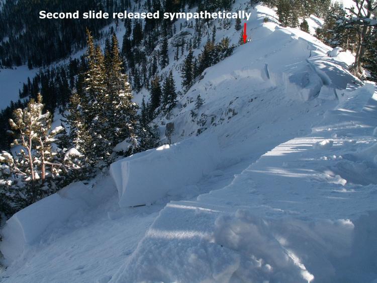 Some skiers had skied the adjacent slope just to the west of the slide not long before I released it. This slide covered up tracks low on the slope. Interestingly enough, I randomly spoke with one of the people that skied the slope. There was very interesting descision making taking place prior to skiing the slope. It was their intention to ski south facing slopes for the day which were much more likely to be stable. Once gaining the ridge the lure of the north facing powder clouded their judgement and they skied into Days Fork luckly without incident. They then climbed back out to the north and experienced collapsing once they were nearing the ridge again. This is a sure sign of an unstable slope and it's my opinion that they narrowly avoided a serious avalanche accident. Once I told the person of the slide I triggered, I said he immediately felt sick to his stomach and that it will take some time to sort through his decision making. Again, thanks to the honest account which will help our community of backcountry users make better descisions.