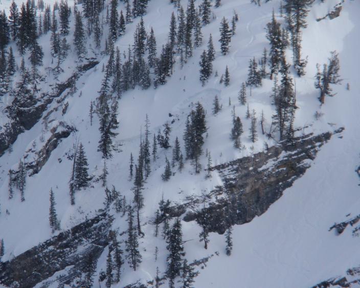 Observed skier triggered slide viewer's left of Jaws. Telephoto from ridge above Main Days acros