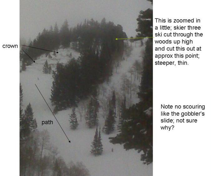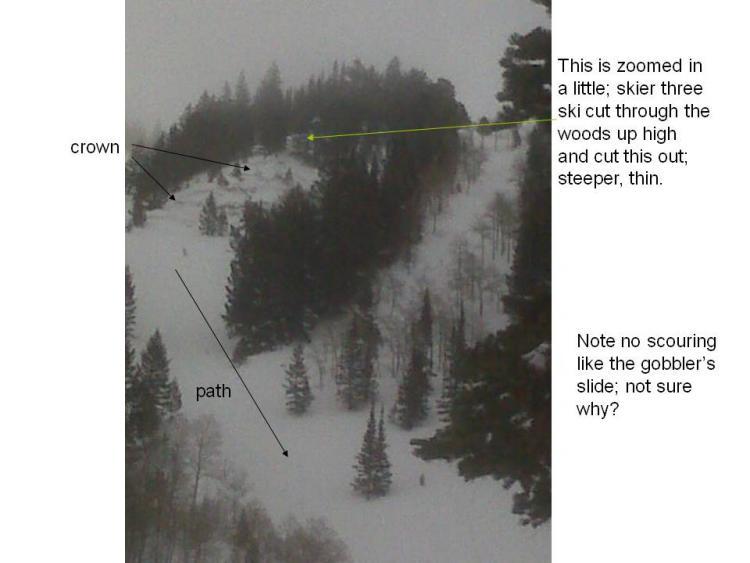 skier 1 skied down a few turns then busted right, through the woods, and into the "main" sho