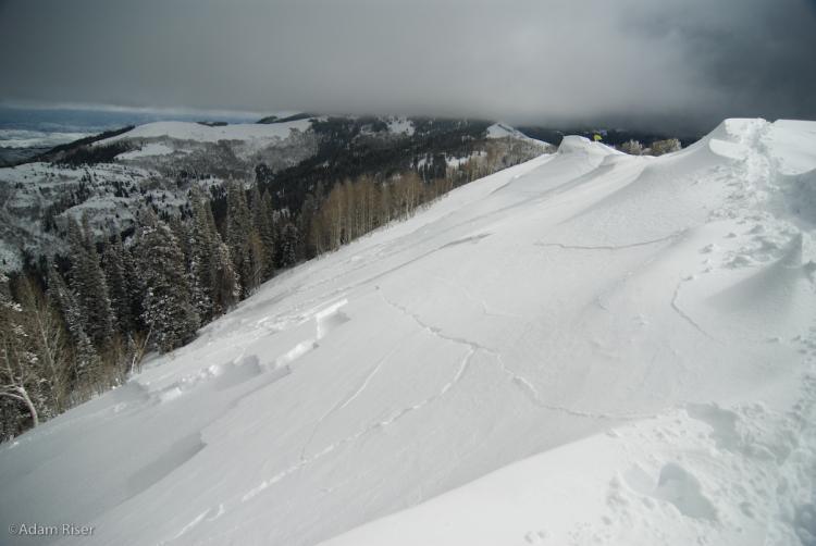 Just walking along this ridge triggered numerous soft slab avalanches. (I'm in the green jacket on the ridge.)