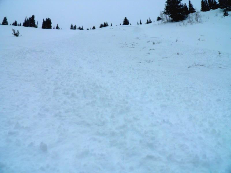 FORECASTER COMMENTS: As we started the day, we anticipated a significant danger and had no intentions of skiing No Name. However, it quickly became apparent the storm didn't produce as expected and conditions were less dangerous. We were finding 4 to 5 inches of loose new snow, very little wind effect. We decided the loose new snow sitting on the old loose facets was not a dangerous situation. This was the case. However, we underestimated the amount of new snow that had drifted enough to produce the pocket that Mark triggered. The pocket itself was not all that scary, basically a moderate sized drift. However, what we both noted was the large pile of debris formed from the initial slab gouging into facets and entraining snow as it traveled all the way down the slope. As Mark noted, this situation is not all that likely right now. Most areas just didn't get the load. Mark and I have a good amount of experience and it should be noted that we made an error in judgment here. Ultimately, not a significant event but any avalanche unintentionally triggered while you're on the slope is too many. - Kobernik