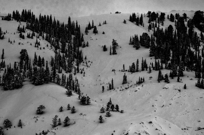 This cluster of avalanches includes the ZeroG chute slide that Bill Brandt reported on 2/9. All of the runouts are above the Environmental Center area of North Fork Park. Visibility wasn't great today, but I was able to make out the outline of a slab near Chilly peak, as well as the large debris piles from at least five individual sub-drainages. It appears possible that all of these slides slid sympathetic to each other, possibly triggered by a slab that failed near the ridgeline. Measured from north to south, this cluster of avalanches spans nearly a mile.