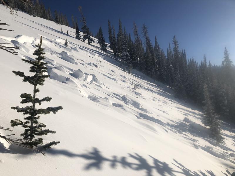 We came across this slide at the end of the day. I'm guessing it happened sometime on Wednesday the 6th or possibly Tuesday the 5th. There was a few inches of snow on the bed surface. Since it was the end of the day and there was still a decent amount of hang fire above the slide I didn't venture onto the bed surface at the crown. It looked to be between two and three feet deep at the crown but it appeared to have stepped down close to the ground. I'd guess the slide either failed at the new snow/old snow interface or, more likely, on the persistent weak layer that formed at the beginning of January, and then stepped down to older snow. Parts of the flanks were 5 feet deep and snow was piled up 6 to 8 feet deep on th uphill side of the trees. The most impressive aspect was the distance the slide ran. I'd say it ran close to 1000 feet or possibly more but the bottom half of the path is relatively forested and it kept making it's way through the trees. D3R3?