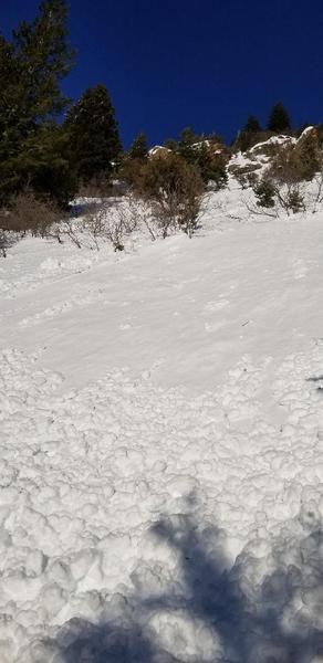 We started a quick afternoon tour around 2:45 and on the way back to the car around 6ish we came across this fresh debris pile that lay across the skin track. While rather small in size, the debris may have knocked you off balance. Had you been there when this slide happened, you could have possibly been pushed off the trail and down the steep hill and through the trees.