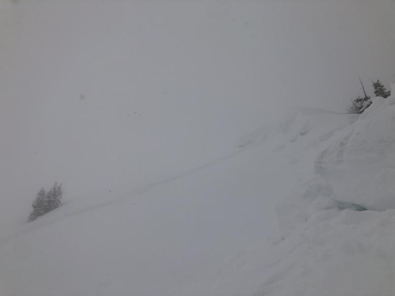 What we did wrong: 1. As was discussed in the avy report, there were varying reports on how well the new snow was bonding. As we were ascending the ridge line, small portions of the storm slab (160cm x 20cm) were breaking off on the steeper portions and during kick turns. This was discussed on the climb, but not before descending. 2. While the slope we ultimately skied was about 32 degrees, the slope under the ridge line where the fracture propagated was approaching 40 degrees. 3. Due to poor visibility, partner lost sight of skier as he was descending, although verbal communication remained intact.