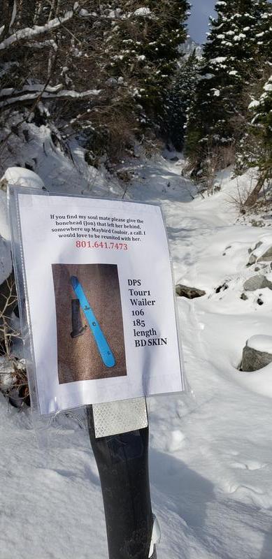 I was face down coughing snow out of my mouth and throat but I wasn’t buried. “Wait I’m not buried., and I didn’t hit the cliff ban.” Once I had my bearings I assessed what was left, I had lost a pole and one ski. The remaining ski was hanging only from my waist loop and had come out of the cross carry shoulder hook. I could see my pole slightly uphill from me and I ran up and grabbed it. Once I retrieved it, I put my one ski on and tried to call and text the other two in my party to see if they were on the ridge, no answer and no response. I turned my beacon to search and proceeded to search the remaining slide below me. I never picked up a signal and the slide's toe after looking at Strava ran about 700 vertical feet below where I stopped, I was taken by the avalanche about 500 vertical feet and it had come from 400 feet above me a total of approximately 1600 vertical feet. I hadn’t seen any other equipment above me and none on the way down besides my helmet that was sitting on top of the toe. After getting off to the side in a safe location I began again trying to call and text for the next 30-40 min and then a call came in and it was one from my party. I proceeded to tell them what had happened and that I was safe.