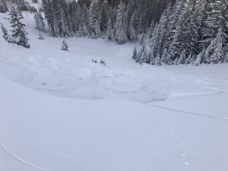 Remotely-triggered avalanche along Park City ridgeline. The avalanche was triggered from an adjacent low-angled ridge - got a loud collapse and the crack propagated to a point where the slope was steep enough to slide. The slope had some wind-loading and this likely created a denser and more-cohesive slab. Depth was 45-60 cms (18-24")