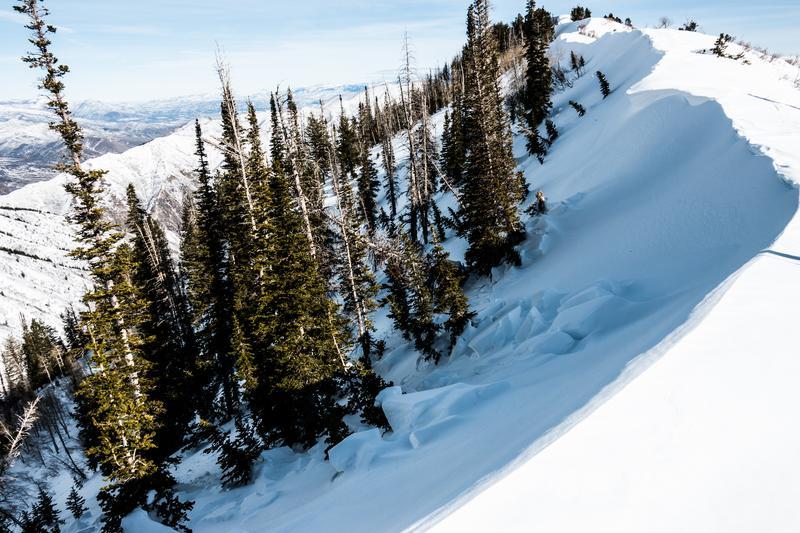 Just about everything steep that faces north through east looked like it had released; many were smaller, shallower looking pockets, some a fair bit bigger, and one monster off of the ridgeline that looked to have a crown near 6' high and had debris that ran all the way over the bench below and out of the frame of the photos. I included photos with and without crown lines highlighted in red, for clarity.