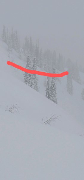 While travelling northwest on Sheep Shit Ridge toward peak 9467 we observed several large cornices and spotted an avalanche on the northeast side of the peak. Getting a good picture was hard with the conditions today, but as best we could tell it was about 12-15" deep and ~250' wide failing in the storm snow.