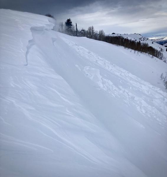 We came around the corner into home run to find a wind slap that was previously triggered. Throughout the day the wind was hard at work moving snow around. It was unknown to us if it was triggered naturally or by a skier (my stipulation is that it was natural). It was small but definitely could take you for a ride.