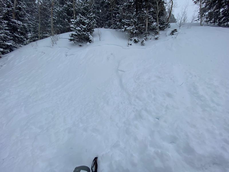 This was triggered just off the skin track riders left side of the track on the way down. As my buddy skied up next to me, the supporting layer of snow at the bottom of the slope was removed and this broke, propagating about 40ft. It was a small slide, so it only came up to our knees. The crown was just below the support from the brush/ trees above it. Looks like it broke on the new/old snow interface. This was on a pretty steep and short slope, about 50 degrees. The photo is taken at the bottom of the slide. It only ran about 20ft.