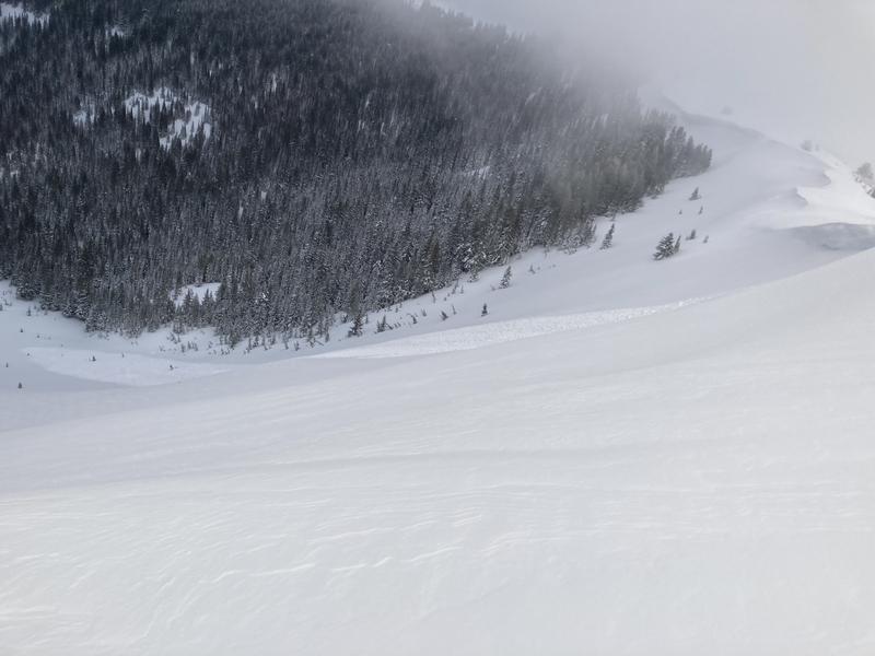 South Monitor cornice flexing today. We got up with just enough sunshine to see this avalanche around 5:30pm. I assume it ran naturally during the heavy snowfall and wind today. It looked to be triggered from a cornice fall with some decent sized blocks in the run out. Almost ran full track but we couldn't get to a position to see up to the crown. Dimensions are estimates but maybe 100+ feet wide, unsure on depth.