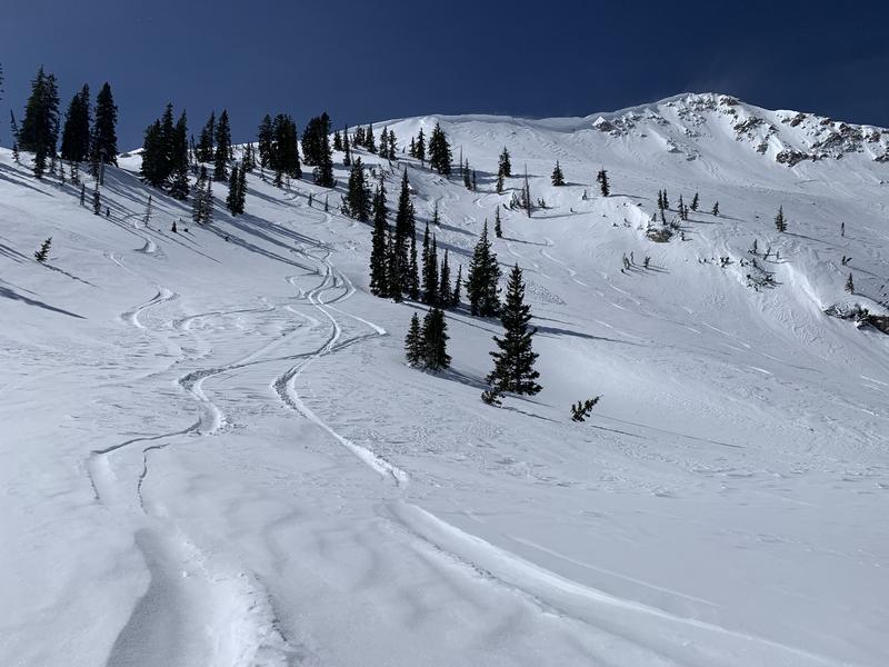 Stronger than expected mid morning winds in upper red pine quickly formed some touchy wind slabs. On lap #2 of the area east of lake shot, triggered this small wind slab. My path was to the skiers right and I was not caught. A few minutes later, another member of our group propagated a crack across a small lower angle bowl. Stuck to lower angle protected trees afterwards.