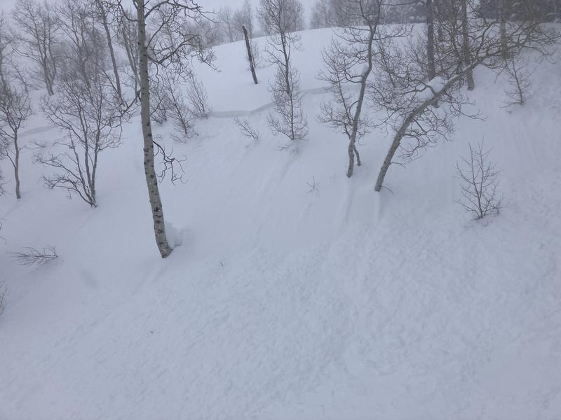Triggered by a skier below the slope. Debris ran over skis and partially buried to the knees.