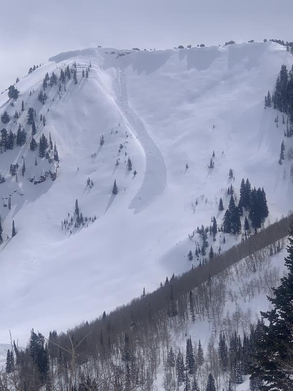 A large avalanche occurred on Squaretop on the park city ridge line between 1 and 3:30 pm on Saturday, April 1st. It appears to have been triggered by a natural cornice collapse, but there were tracks on the other side of the spine from the avalanche path, so it could have been triggered by a skier.