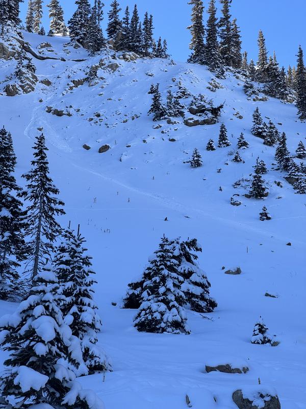 Up skiing at Sunset Peak on 11/22/25 and noticed a snowboarder had triggered a small avalanche on a north facing aspect probably a day or two ago. Base up there is around 40 cm on prob so about 15 inches. Dug a pit and collapse within first 5 taps not very strong base with multiple concerning layers. Very dry weak snow with a with two more compacted icier layers in between the loose dry layers.