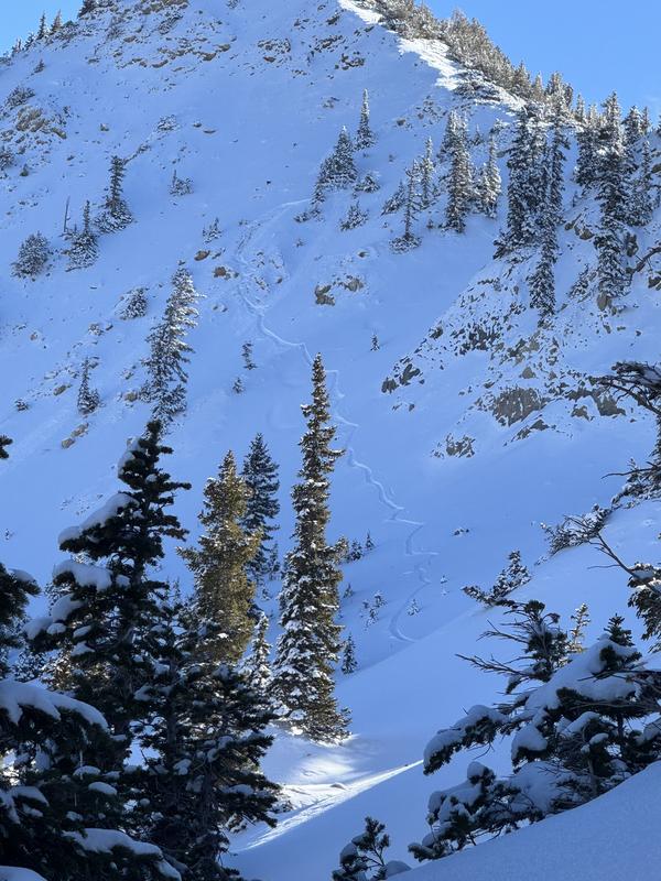 This was the second avalanche we noticed while out touring in Sunset Peak area. Base up there is around 40 cm on prob so about 15 inches. Dug a pit and collapse within first 5 taps not very strong base with multiple concerning layers. Very dry weak snow with a with two more compacted icier layers in between the loose dry layers.