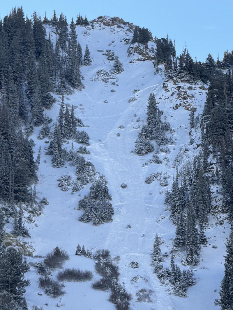 Reported as triggered by a coyote who narrowly escaped. It appears that the initial slide triggered two lower pockets and perhaps sympathetic'd another pocket to looker's right.