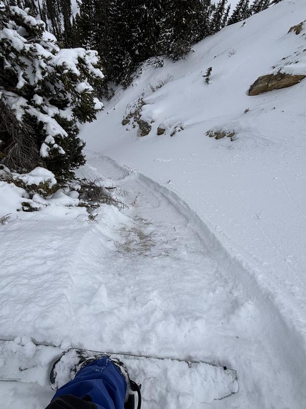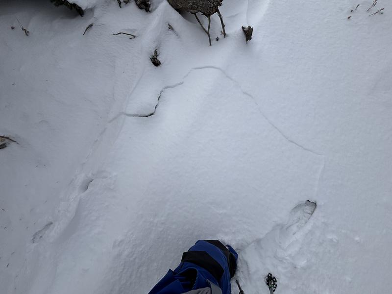 I also had small localized collapsing and cracking around buried roots and rocks on shady aspects. The snow was shallow across the drainage with the deepest windloaded aspects barely reaching 2ft.