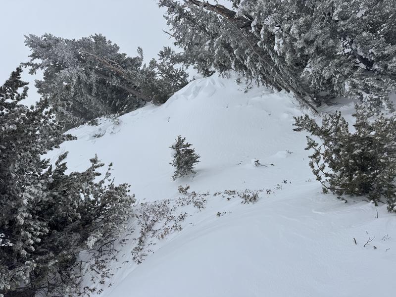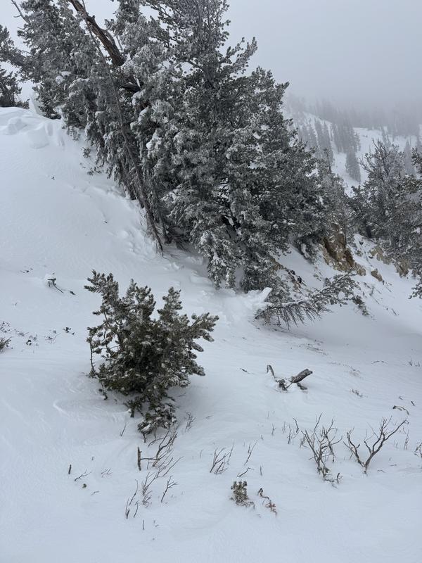 In the upper elevations the wind was blowing from the west consistently in the strong category, light snow was still falling out of the sky, and the sky was mostly obscured. The crown of the avi I saw had already started to degrade on account of the wind. The riding conditions were pretty decent - surfy fun snow that had thankfully caked in around the rocks pretty well. It's a good time for cleaning off the cobwebs, learning about a nasty snowpack structure, and practicing with your beacon (nice to see Coyne leading an epic beaconeering group)! Hopefully it keeps comin'...
