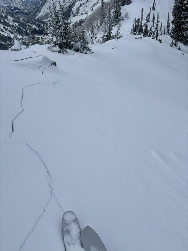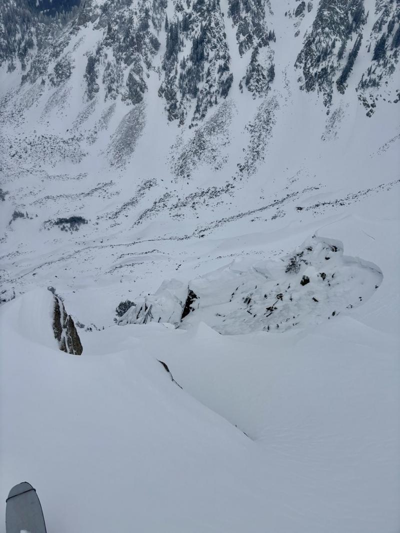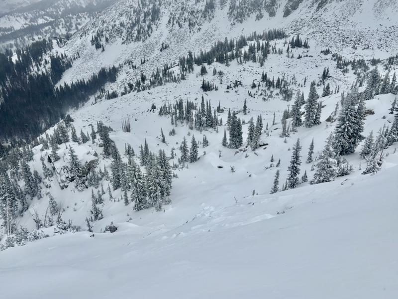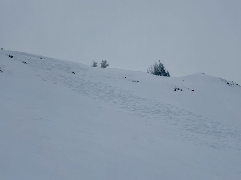 As I walked the ridgeline, 2 of my collapses remotely triggered avalanches 14-18" deep as they reached avalanche-prone slope angles (Pics 1, 2). These slides were limited in width due to rocky, complex terrain but propagated cleanly with minimal connection.