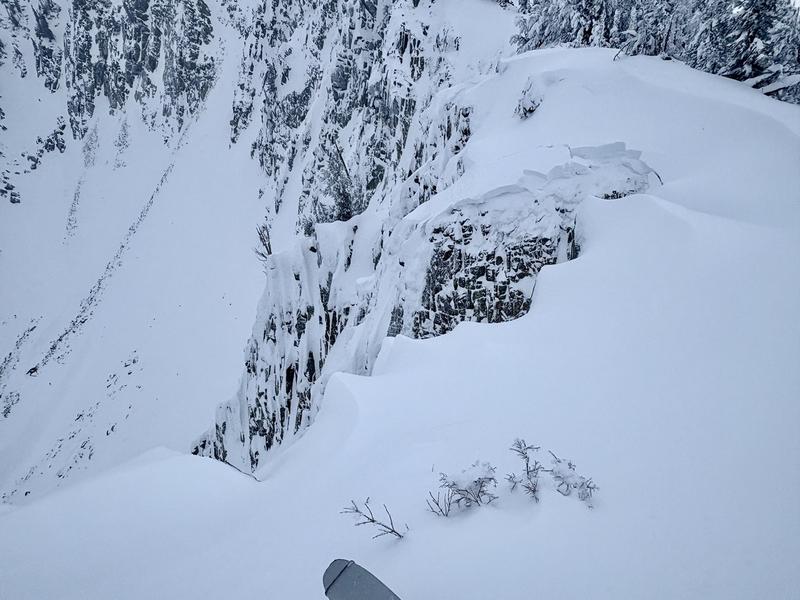 I was interested to see a number of areas that appeared to have naturaled during the storm (PIcs 4, 5) and had the bed surfaced lightly covered by new snow. The biggest of these was ~100 wide, 10-14" deep and likely occurred early this morning.