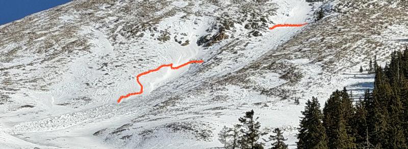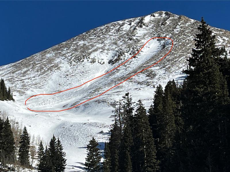 We observed this avalanche on Thursday, December 11. Strong winds out of the northwest blew for 12 hours on Saturday night into Sunday morning. Eric traveled this route on Sunday, December 7, and did not see any slide debris along this path. This slide must have occurred after that. As of 6 AM on 12/11, strong winds from the northwest blew for a continuous 72-hour period. The avalanche most likely occurred during this wind event, and the debris looked relatively fresh.