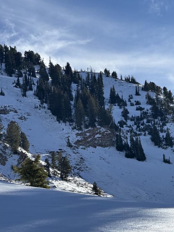 Saw a large crown on Gobbs that wrapped around the most northerly aspect of Davis gulch towards lookers right trending to bobsled. The photo isn't super clear but the crown propagated to multiple fall lines/ zones and it was rather large. It likely failed on the rain crust near the bottom of the pack. We dug and got CT23 ~18 inches down. No propagation on an ECT. Gonna be hairball if/when winter shows up. No major loading event in the forecast but eventually we will hit a tipping point and this is going to be a major problem layer. Last photo also shows the upper crust which would fail on like CT 5-8 or so, and also may start to be a problem. The top of the pack is faceting quick and in a few days is going to be loud. Not sure when this slide happened but I would guess a few days after the YJ slide as whoever saw that one likely put in the skinner we took today, and didn't report this one. Maybe it was an animal trigger too. Definitely some deer/moose tracks/ poo on the skinner.