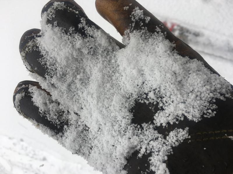 Getting ready to traverse from Intermediate Ridge back to main ridge and exit back to Alta. Stopped group high under rocks to discuss strategy. Reached forward to do a quick hand pit and triggered the slide as my weight shifted. It was unintentional but not unexpected. What was unexpected, was the sensitivity of the new snow and how far it propagated and ran. It was mostly harmless but did stack up enough snow in the trees to bury a person. Depth ranged from 3" to 12". I also remotely triggered the North Face of Cardiff Peak on our way out, the entire width 6-10" deep and running over the cliff band. With the slick "graupel" footing today, either of these slides were capable of causing a person to lose balance or be knocked over and could be consequential in some terrain.