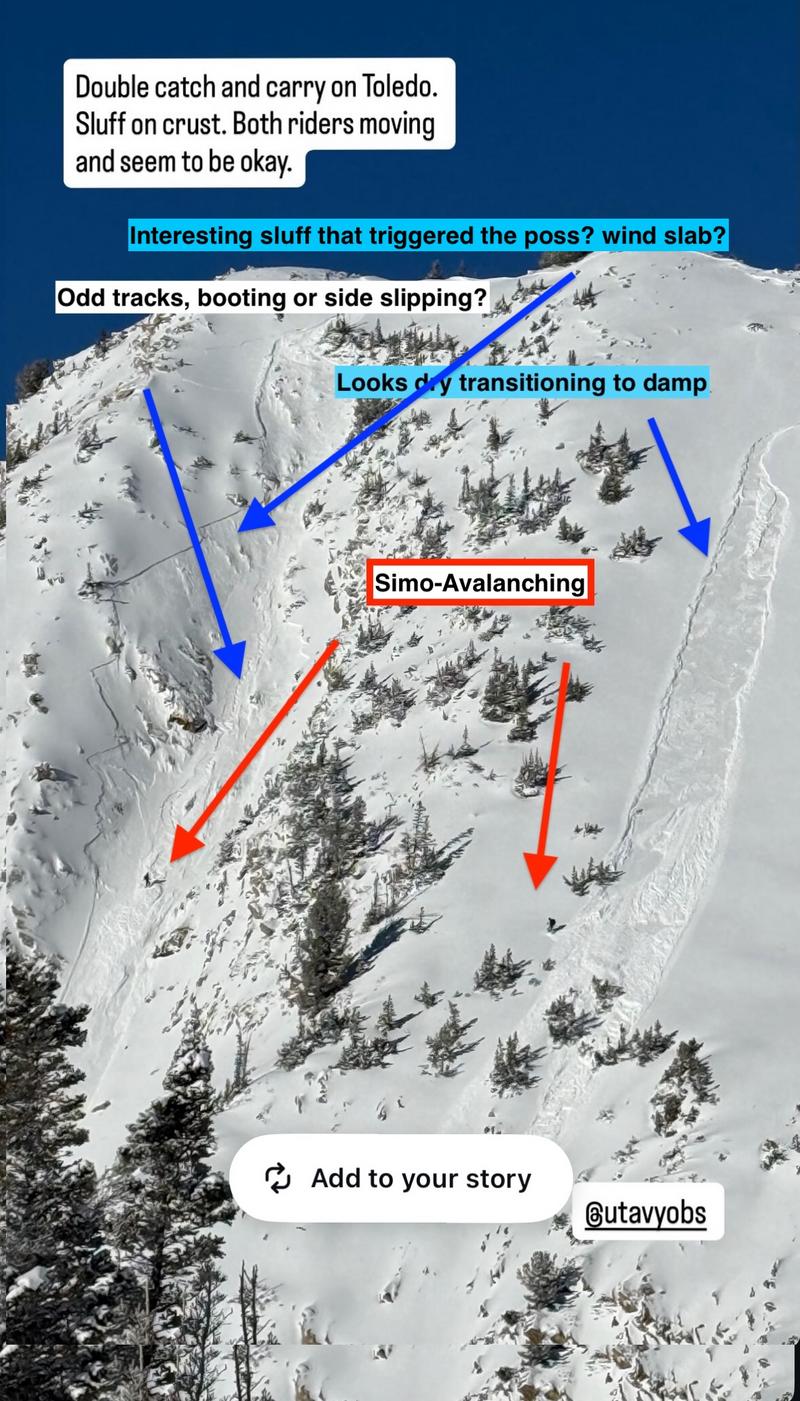 Sunday: Sunday dawns clear with a few crystals of snow lingering from the departing clouds. The Wasatch regains some of its legendary form: top-shelf powder skiing and riding, a crowded backcountry of hungry enthusiasts who have endured one of the worst seasons on record, and more than a couple of catch-and-carrys, as well as a very close call involving the PWL. Two skiers are simultaneously caught and carried in parallel Toledo Chutes: one in a dry sluff, the other in a sluff that subsequently triggered a more widely propagating soft slab. Both came out mostly unscathed. Another skier is caught and carried in a sluff on Little Superior. The rain crust is an ice rink - when people start sliding, they have a difficult time arresting or coming to a stop.