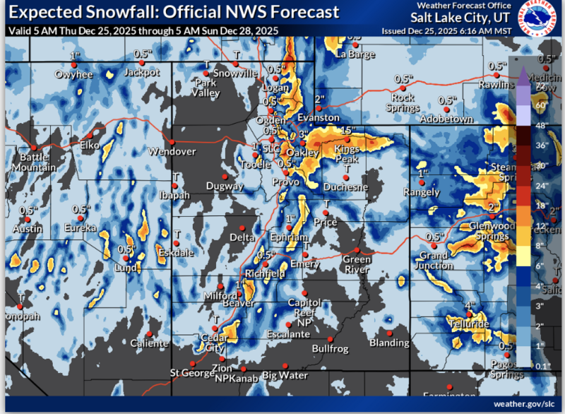 *Heavy snowfall is likely on Friday and Friday night, with up to 20 inches of accumulation from the storm possible at upper elevations in the Bear River Range. While this is very welcome news, the Boxing Day storm will elevate avalanche danger in the backcountry.