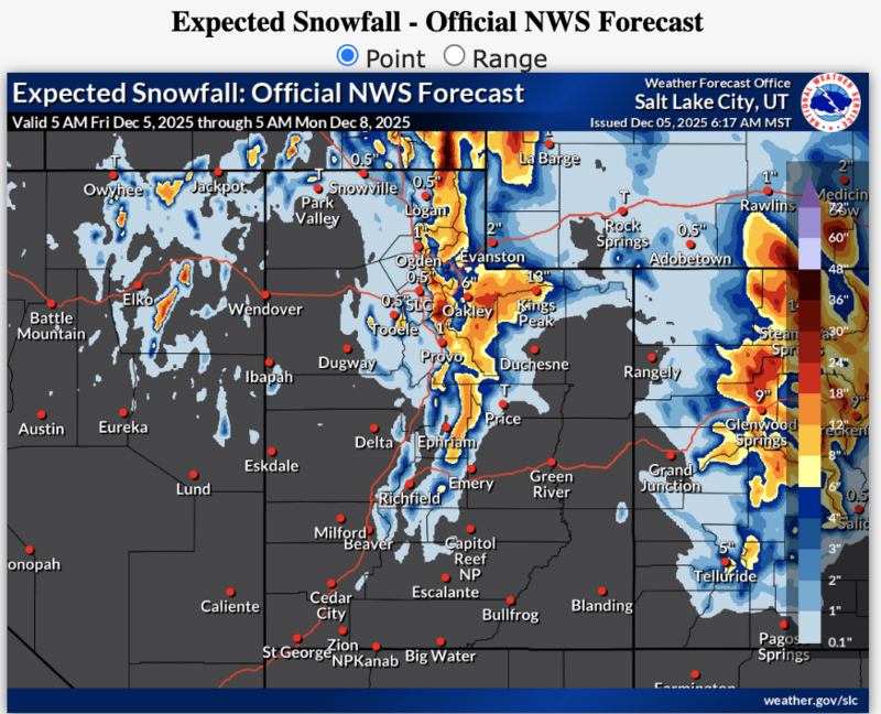 The National Weather Service has issued a Winter Storm Warning for the northern mountains, including the Logan Zone, through early Sunday morning. *This from this morning's NWS forecast discussion: "A significant winter storm will impact northern and central Utah through Sunday morning. The potential for unsettled weather continues through the middle of the upcoming week."