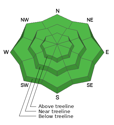 The danger rose has been full green since December 10th, with no avalanche problems listed. This afternoon, we will develop our first avalanche problem in quite some time in the form of wind-drifted snow. Expect slabs of wind-drifted snow to form on leeward slopes above treeline. Like all storms this season, this one is difficult to forecast, and I am a little unsure of the timing. One thing that's for sure is that new snow and wind create wind slabs. Pay attention to changing conditions, and it will be easy to avoid any avalanche problems today.