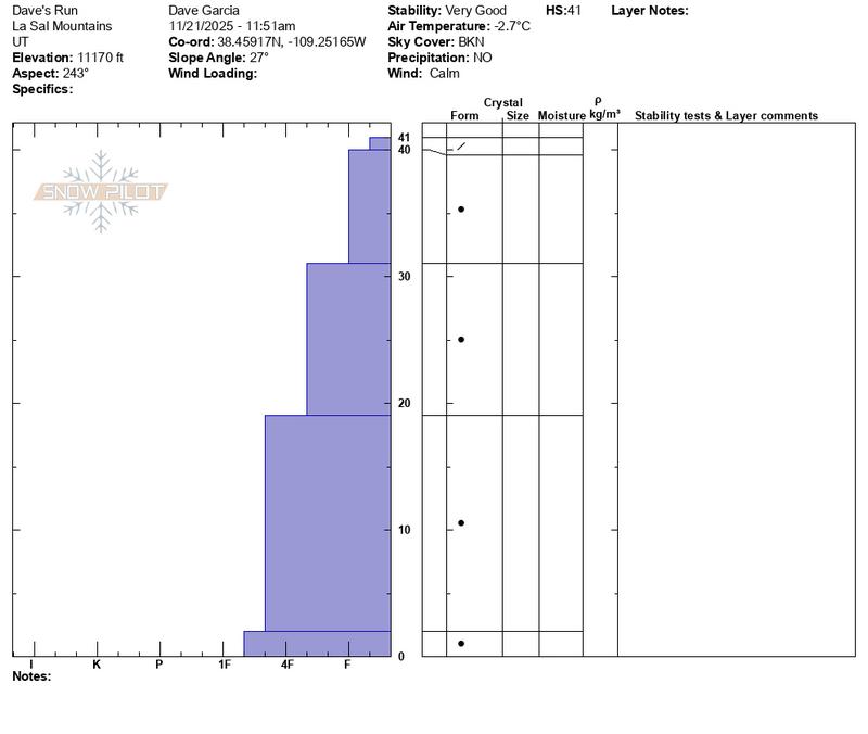 The snow is starting to pile up in the La Sals thanks to a series of warm and wet November storms. We have plenty of snow to ski around on summer roads and shakedown your winter equipment. There is 10" of settled snow at 10,000' and 16" in the upper elevations. This is not quite enough for skiing or riding, but it's a good start. Regular avalanche forecasting will begin when we get more snow.