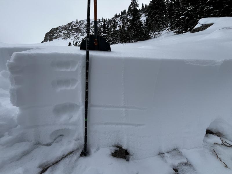 The photo and snowpit below illustrate my findings on a NE aspect near tree line at 10,600'. The overriding soft slab is slightly denser here than in other locations, and the base is obviously growing weaker, but three extended column tests failed to produce propagation.