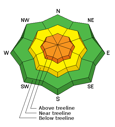At and above treeline, especially in the wind zone, you'll find CONSIDERABLE avalanche danger. Both human triggered and natural avalanches are LIKELY on steep wind drifted slopes, especially in terrain with an easterly component to its aspect. Once triggered, today's avalanches will fan out, entraining more snow than you might expect.
