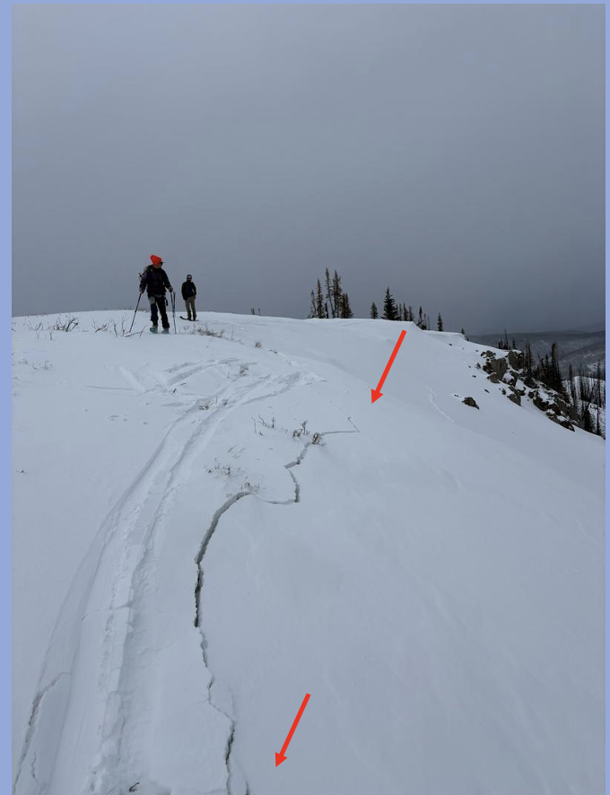 No new avy activity to report from yesterday, but audible collapses (whumpfs) and shooting cracks like in the image above from the Wolf Creek zone are big red flags, suggesting the snowpack is getting cranky.