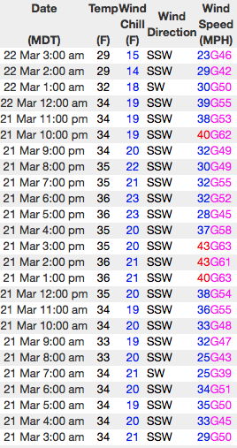 Above... 24 hour data from Windy Peak (10,600') and the Strawberry Divide snotel site (8,123') reflecting about half the snow of the North Slope as well as a marginal overnight refreeze.