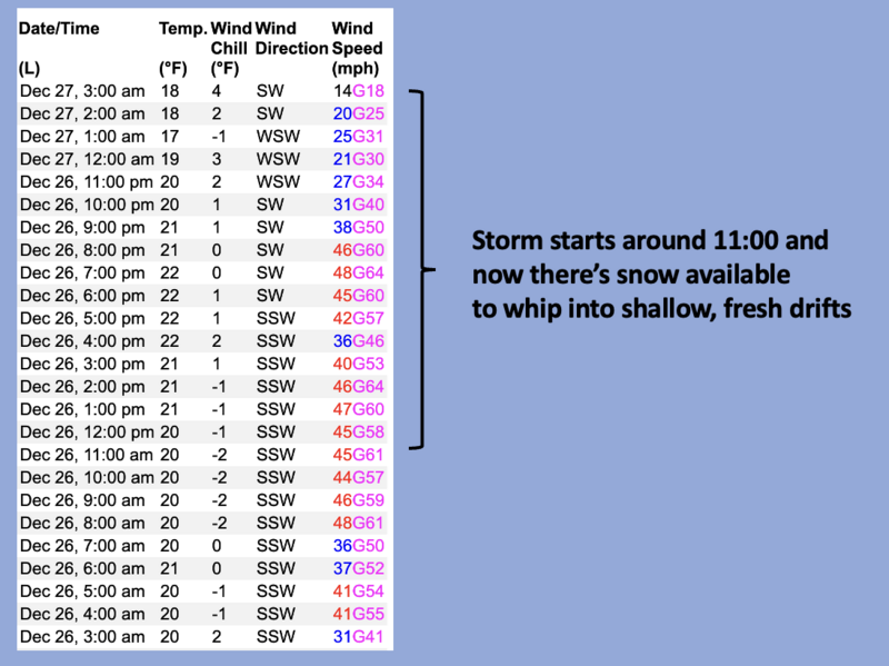 Most slopes offer generally LOW avalanche danger this morning, increasing to MODERATE avalanche hazard as today's storm materializes. Fresh drifts will react to our additional weight and human triggered avalanches are POSSIBLE particularly on the leeward side of mid and upper elevation terrain. Note to self... todays fresh drifts form on a slick Christmas Eve raincrust and once initiated, may run faster and further than we might expect.