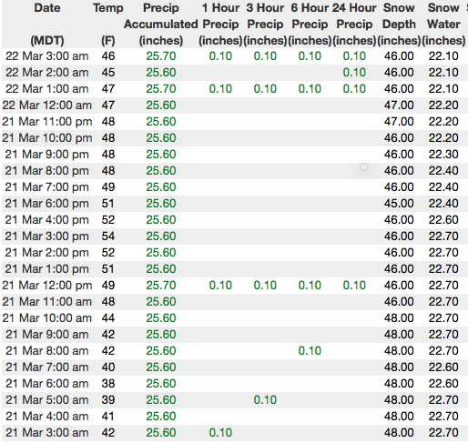 Above... 24 hour data from Windy Peak (10,600') and the Strawberry Divide snotel site (8,123') reflecting about half the snow of the North Slope as well as a marginal overnight refreeze.