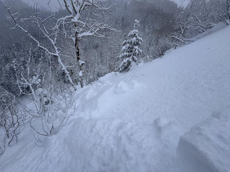 Naturally triggered slab that had already slid by the time we arrived. Broke atop a short rollover with steeper slope in otherwise low-angle terrain. Didn't run very far but failed nearly two feet deep. Pictures taken at 9:30 am, 40.6688472,-111.6477972