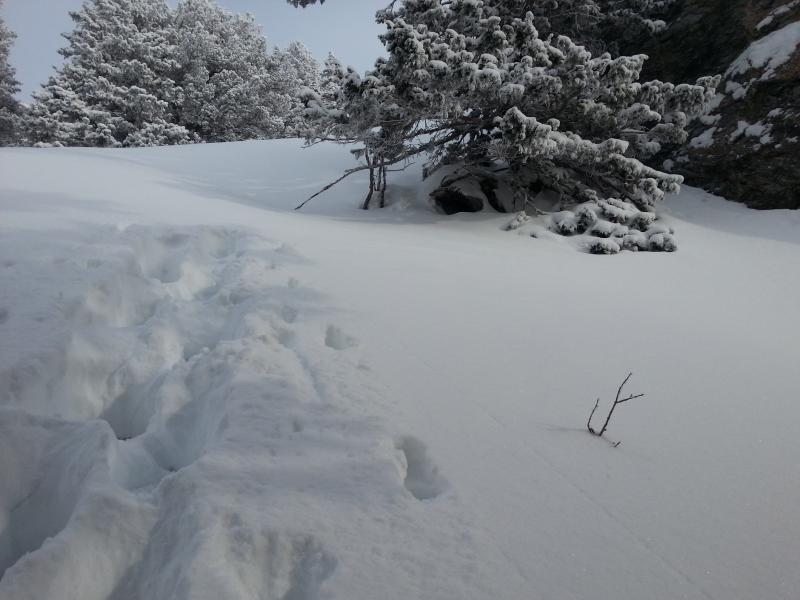 This spot was about 200 feet down from the ridge, with 10" of fresh powder in the previous 48 hours, much more than the reported 2".