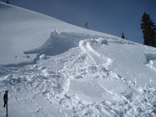 Stomping around on this small safe test slope, I was finally able to get a small soft slab 10-12" deep to crack and sluff. These were manageable in size and did not pose much threat, unless a person was in steep and unforgiving terrain.