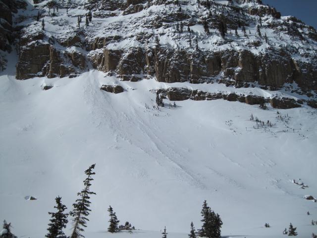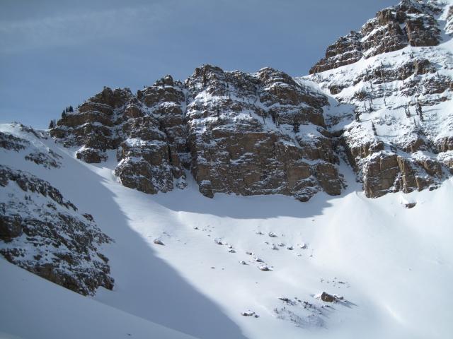 The upper elevation terrain around Bald Mt. has filled in some over the winter, but there are still some rocks showing. In the second photo the aprons underneath Reid's Pk. have some old debris from the last natural avalanche cycle.