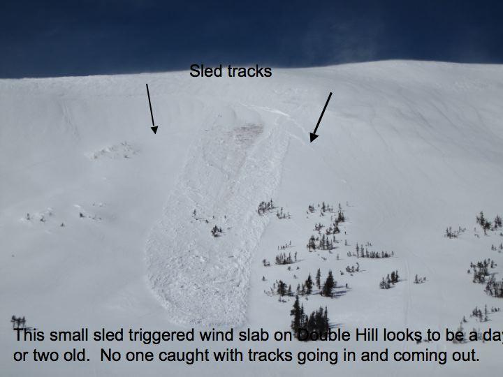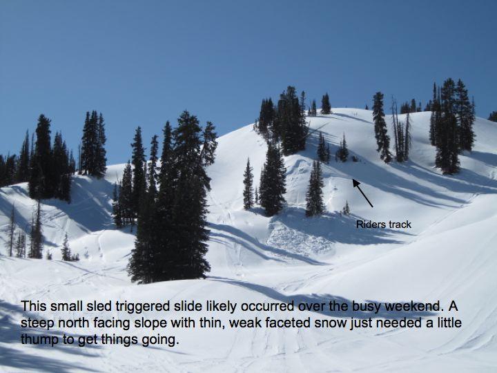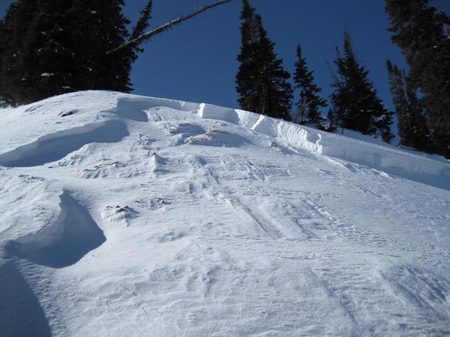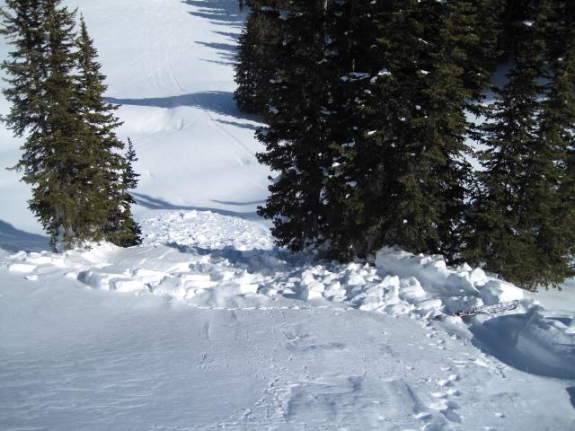 A small pocket that was triggered this weekend on an east facing slope about 10,000'. It looks like it broke into old snow near the ground. This slope receives a lot of wind loading from southwest winds.