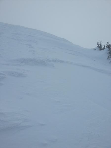 Below is the same spot I posted a photo of two days ago, near the top of Mt Allen. Note that the lumpy thick windslab formations are eroded down, and more wind deposits have smoothed it out.