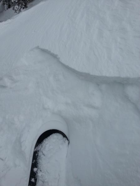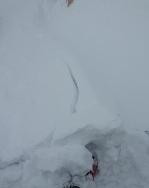 Here is an unusual crack running down the fall line, following a wind lip running down the fall line. This was a 6" deep pocket, about snowboard width.